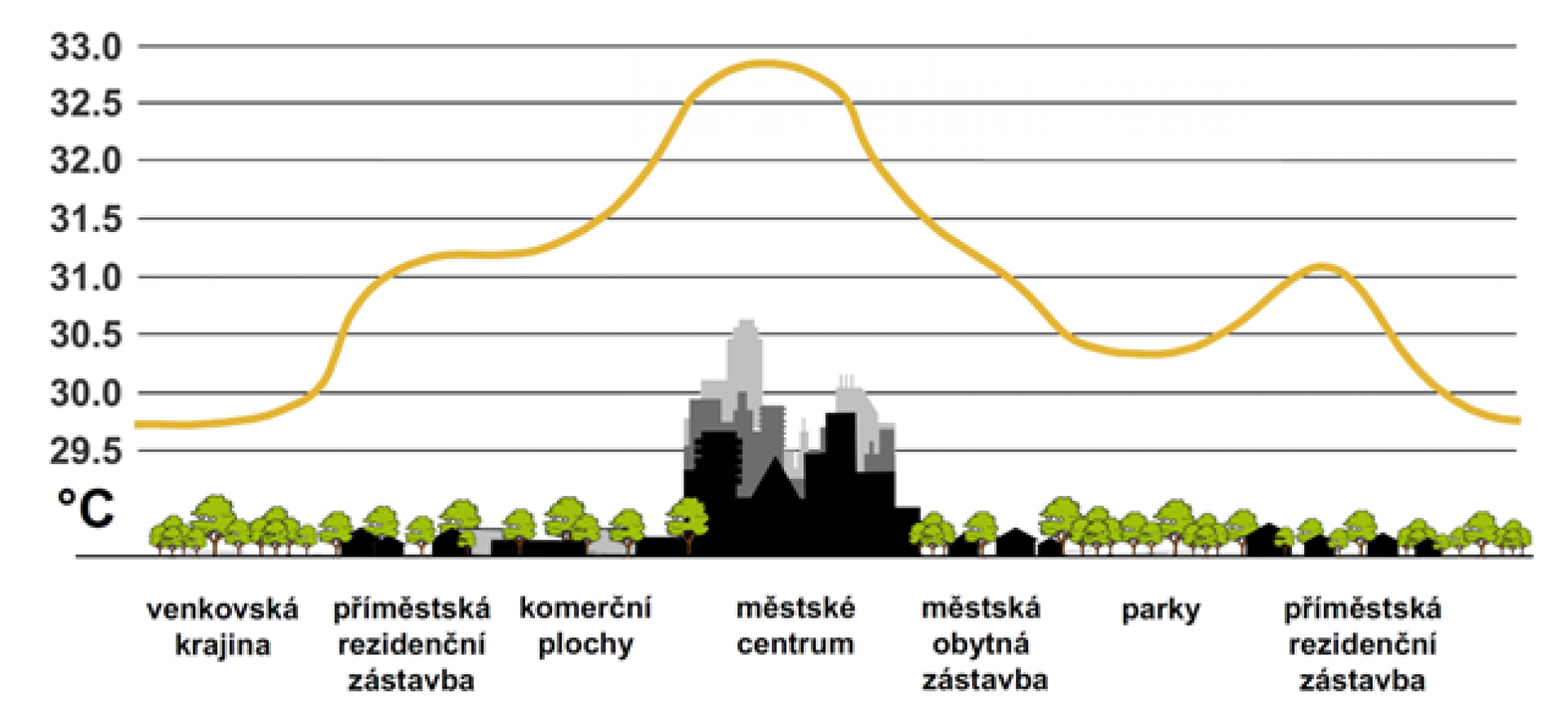 Jedním z nejvážnějších problémů současných měst je jev městských tepelných ostrovů (Urban Heat Islands – UHI). Je způsoben akumulací tepla v betonu, asfaltu a dalších površích s nízkou odrazivostí (albedo) a nedostatkem propustných a zelených ploch. Termovizní měření v Praze a dalších evropských městech prokazují rozdíl mezi teplotou zastavěných částí a okolní krajinou 3–8 °C ve dne a až 12 °C v noci. Následkem je zvýšená potřeba klimatizace, která dále zvyšuje energetickou spotřebu i produkci tepla.