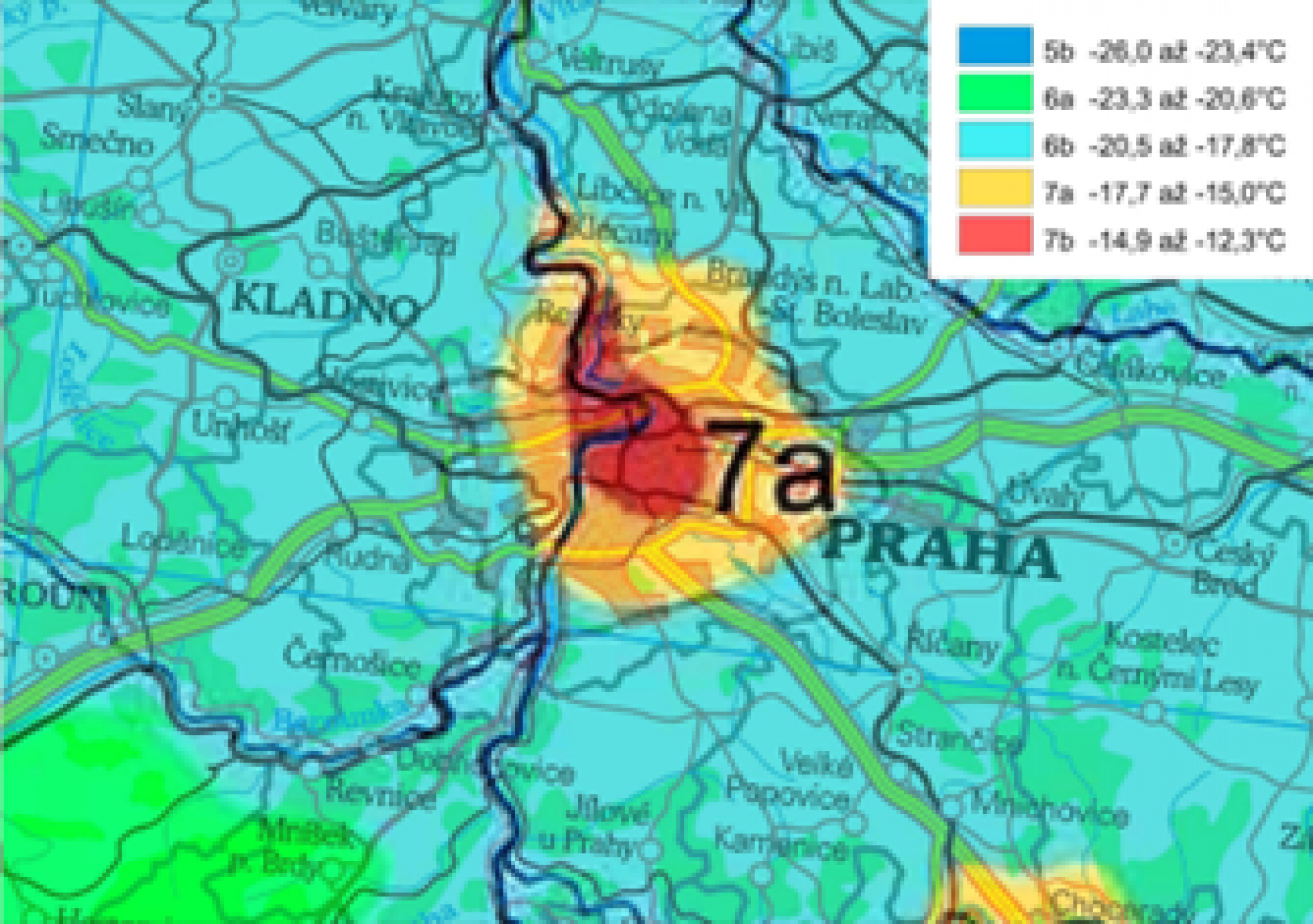 Obrázek: Tepelný ostrov města – schéma Obrázek: Tepelný ostrov města je patrný také na mapě zón mrazuvzdornosti